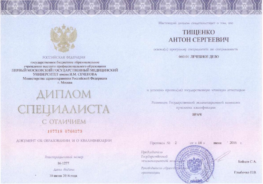 2016 г. Первый Московский государственный медицинский университет имени И.М. Сеченова Министерства здравоохранения Российской Федерации по специальности «Лечебное дело»