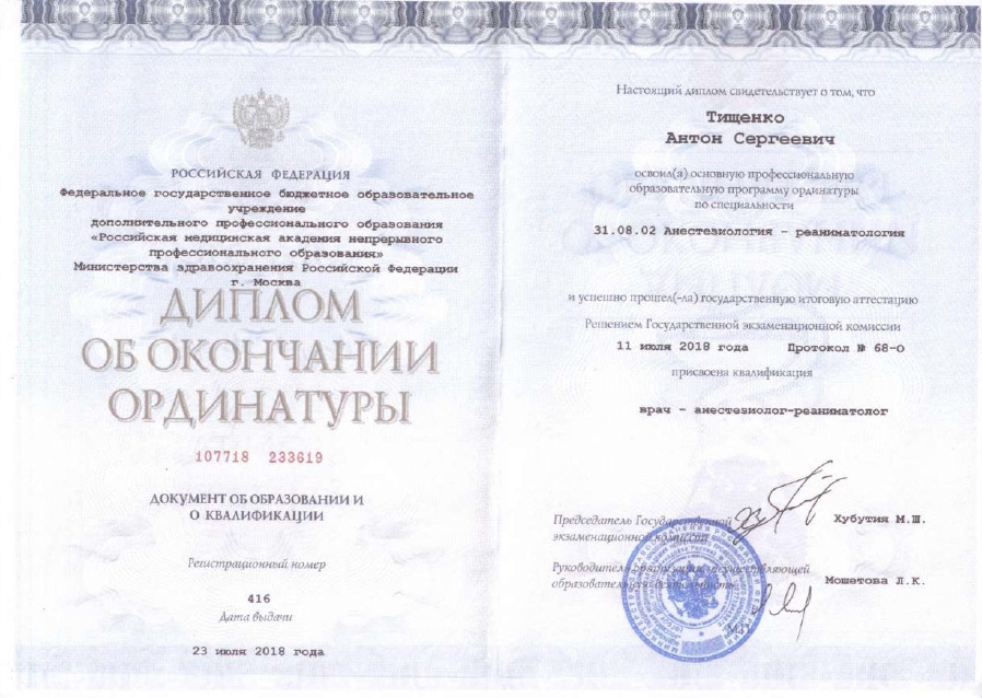 2018 г. Ординатура в «Российской медицинской академии непрерывного профессионального образования» по специальности «Анестезиология-реаниматология»