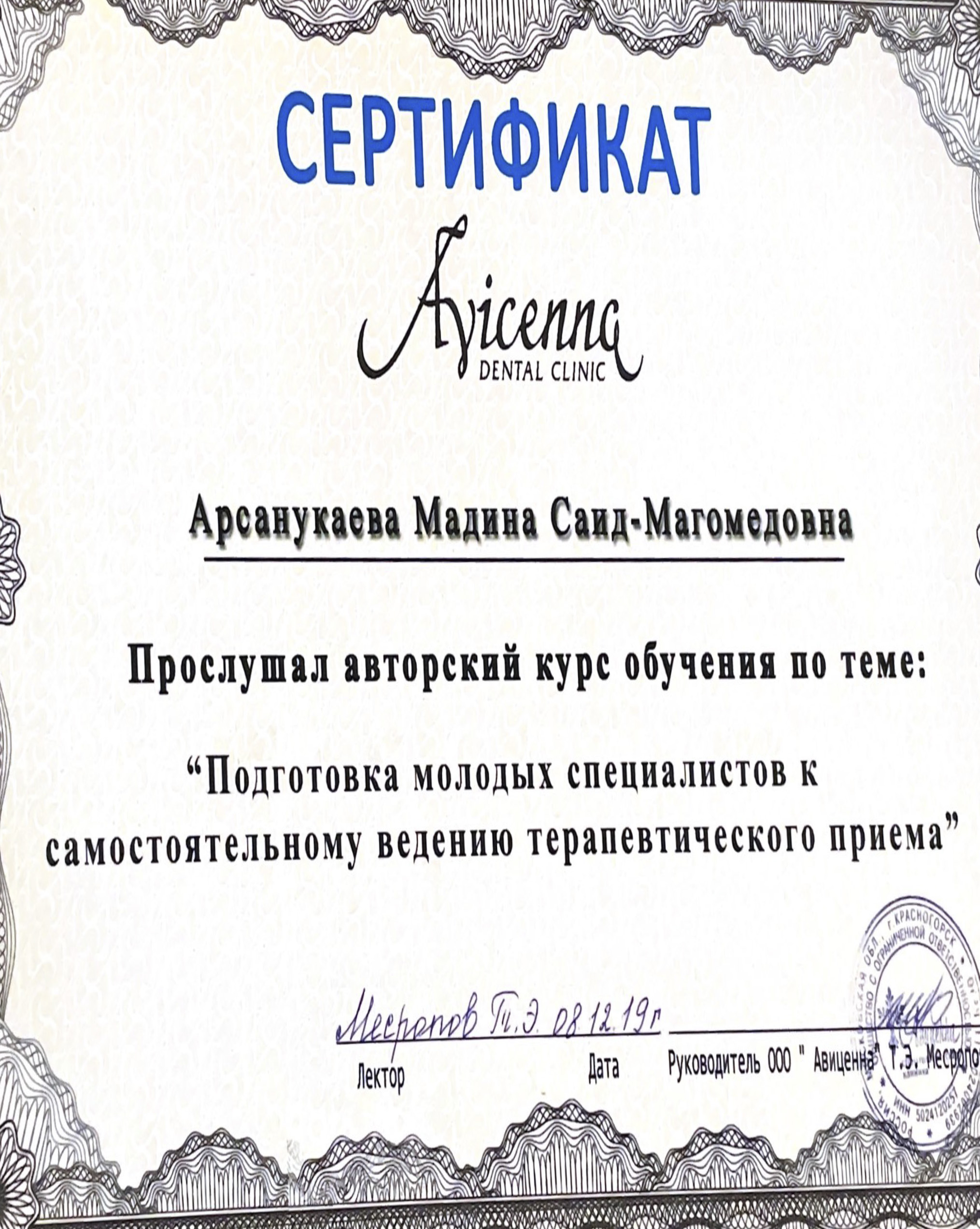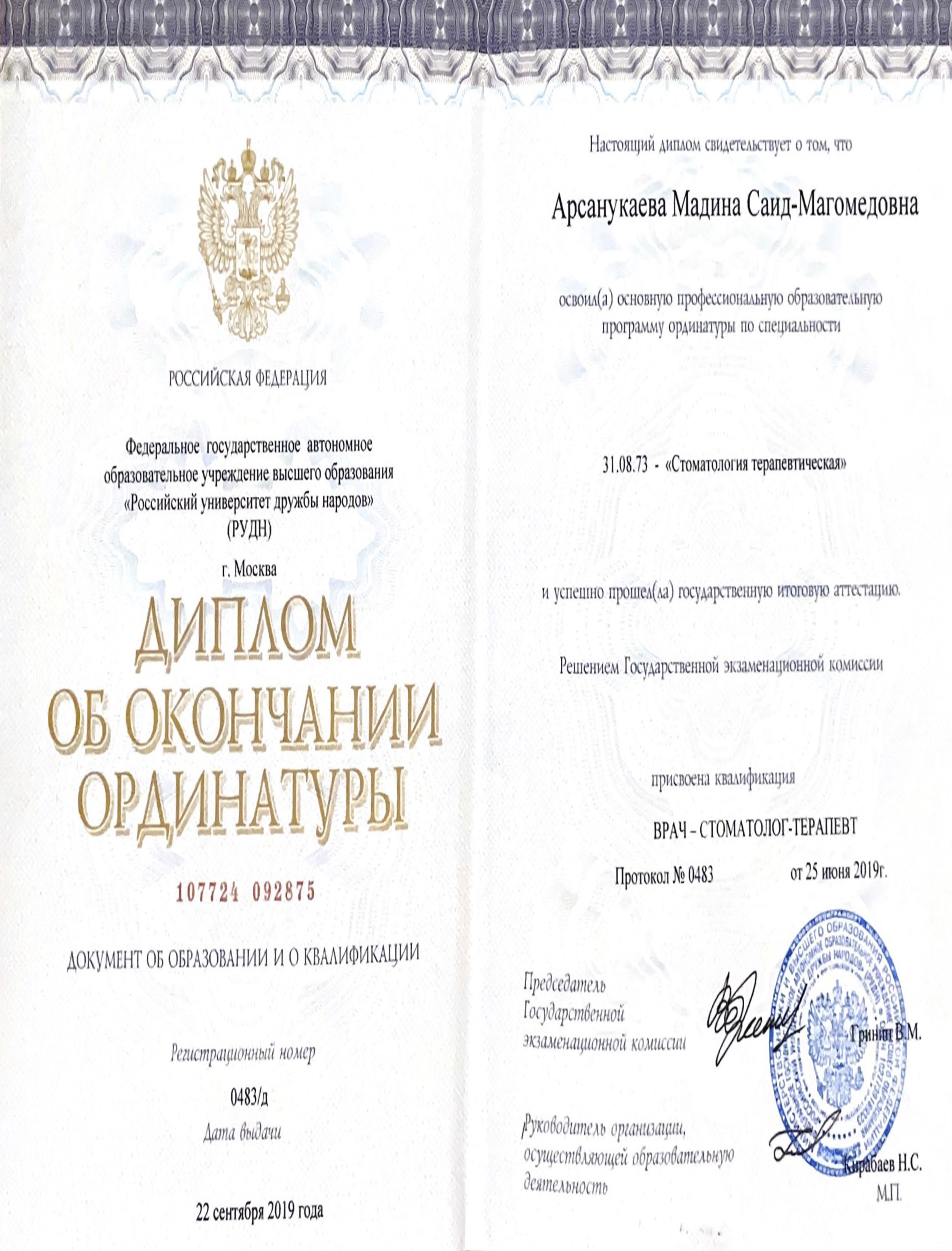 2019Клиническая ординатура на базе Российский университет дружбы народов (РУДН) по специальности «Стоматология терапевтическая» (107724 092875 № 0483/д)