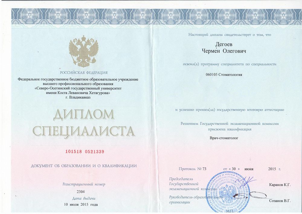 2015 г. Северо‑Осетинский государственный университет имени К. Л. Хетагурова. Специальность: стоматология (базовое образование).
