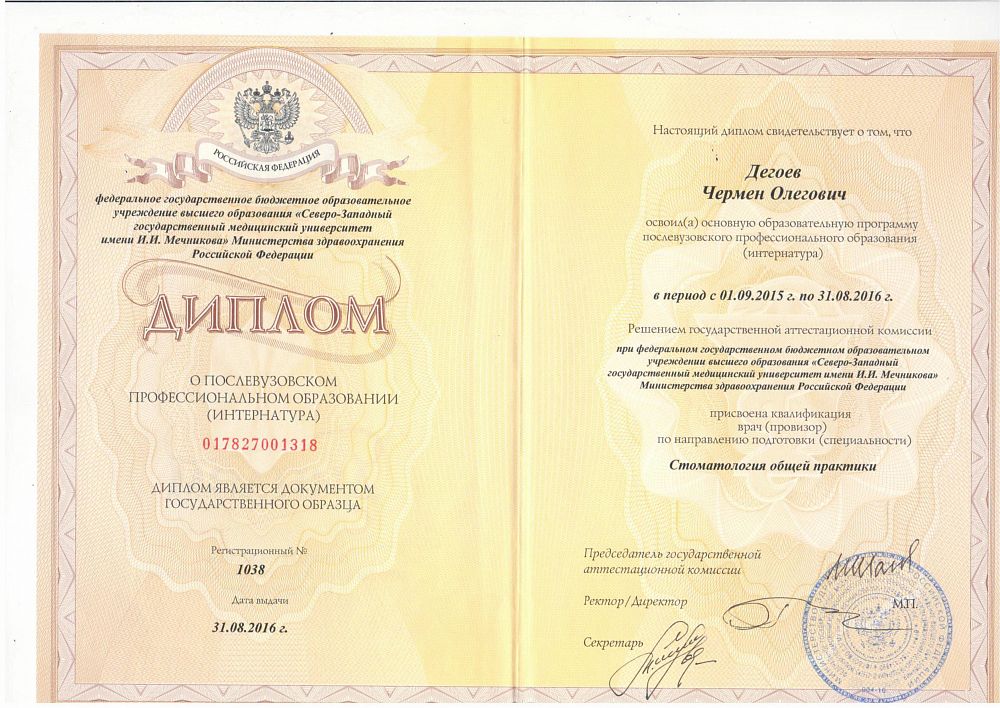 2016 г. Интернатура по стоматологии Санкт‑Петербургская медицинская академия последипломного образования (СПбМАПО).