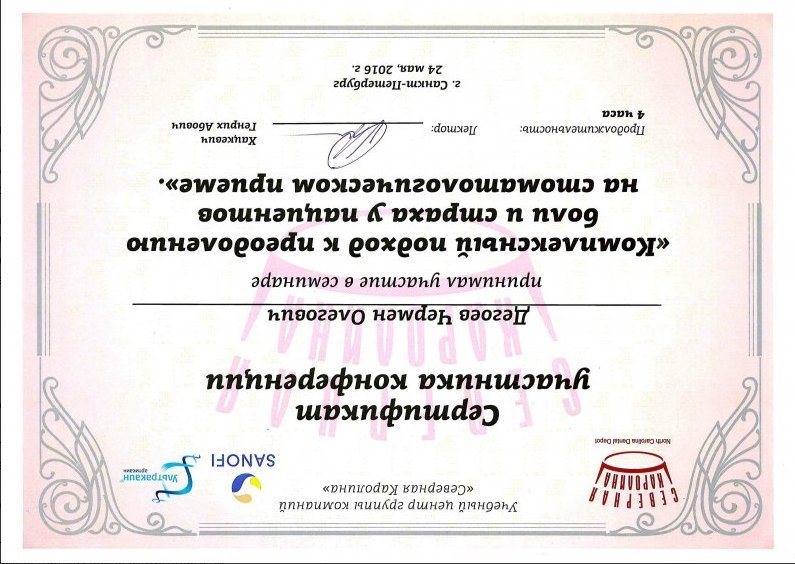 2016 г. курс «Комплексный подход к преодолению боли и страха у пациентов на стоматологическом приёме»;
