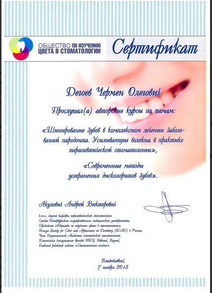 2017 г. курс «Протезирование в эстетически важной зоне. Штифт или вкладка. Выживаемость восстановленных зубов после эндодонтического лечения»;