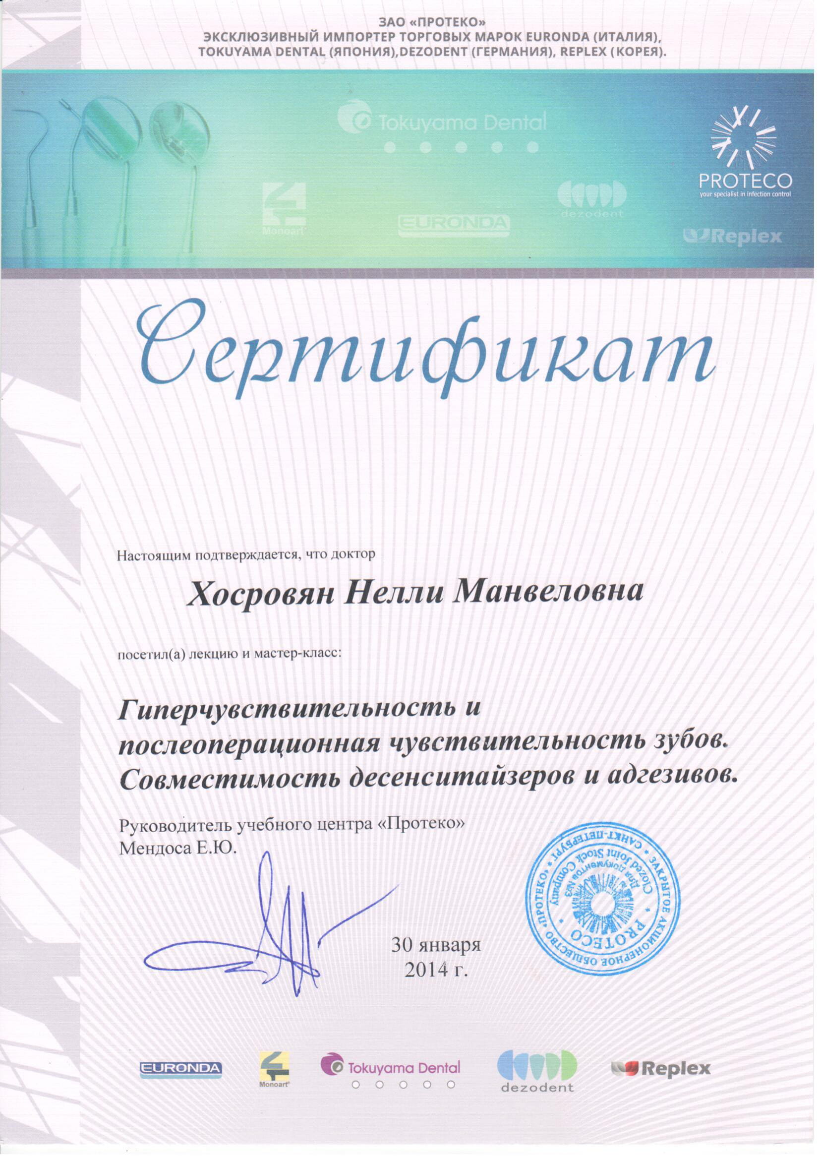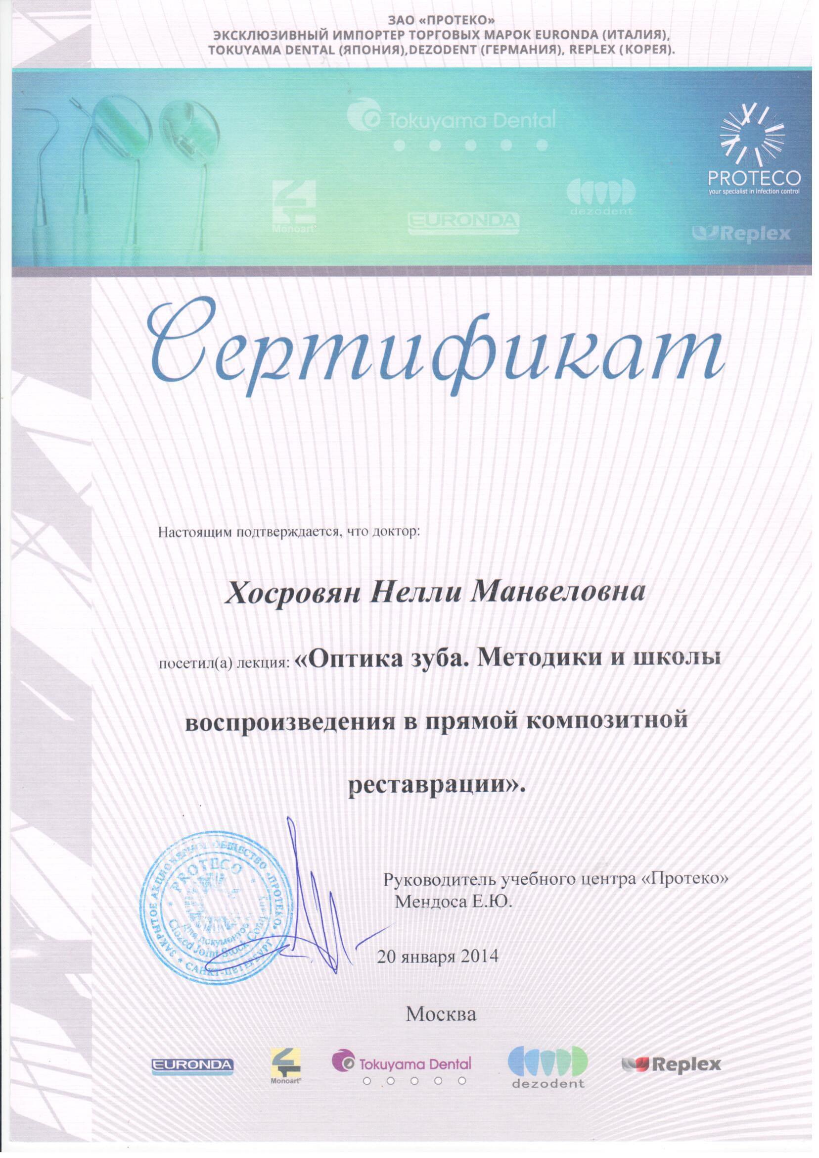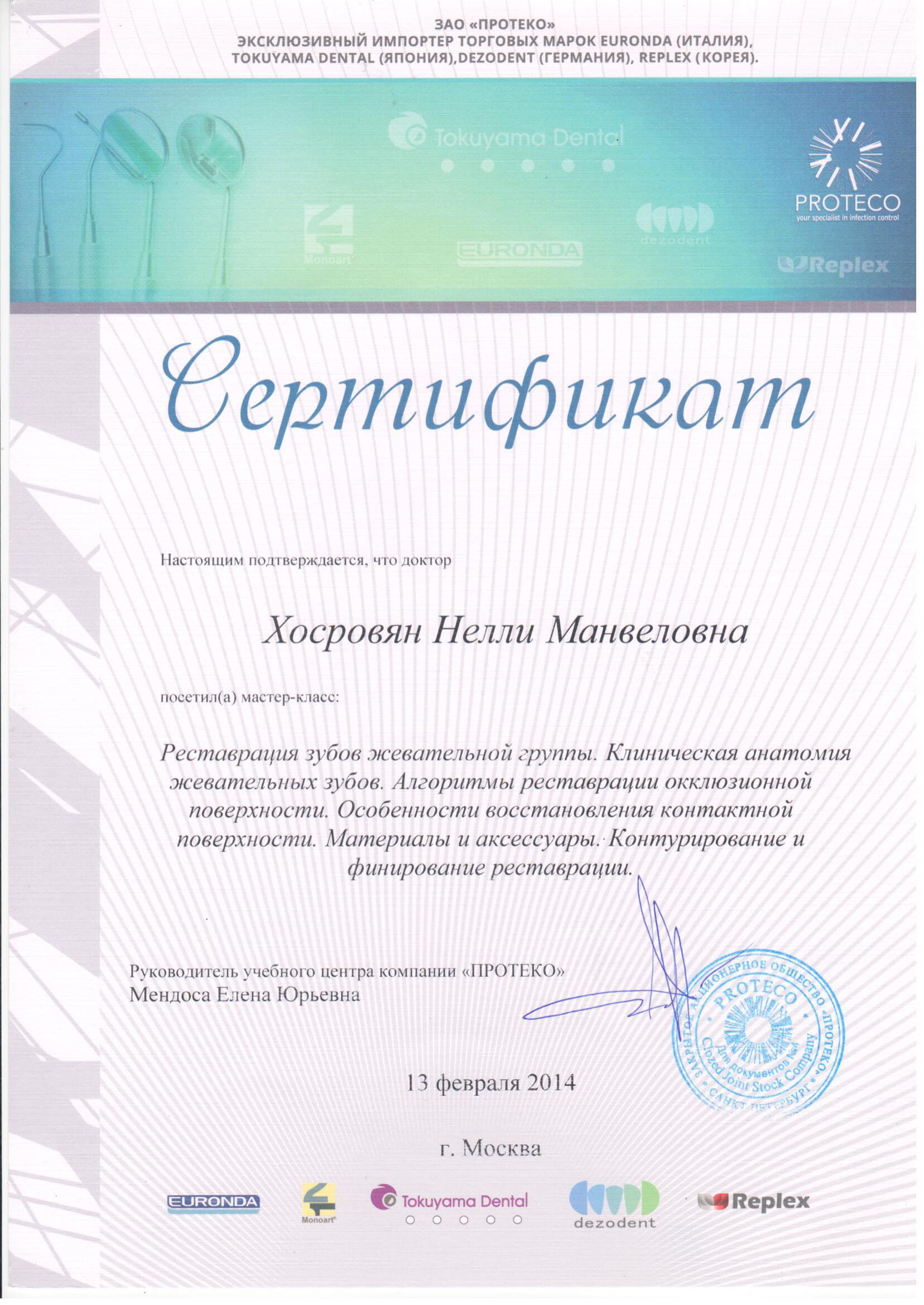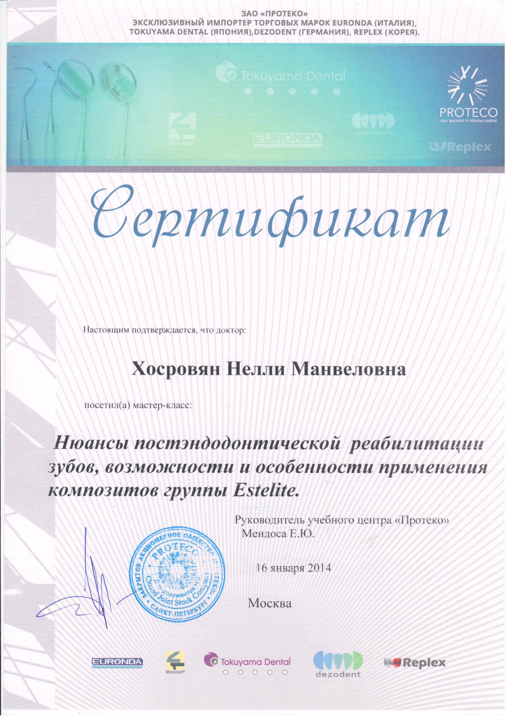 - 2014 г. – мастер-класс «Нюансы постэндодонтической реабилитации зубов, возможности и особенности применения композитов группы Estelite», Мендоса Е.Ю г.Москва.