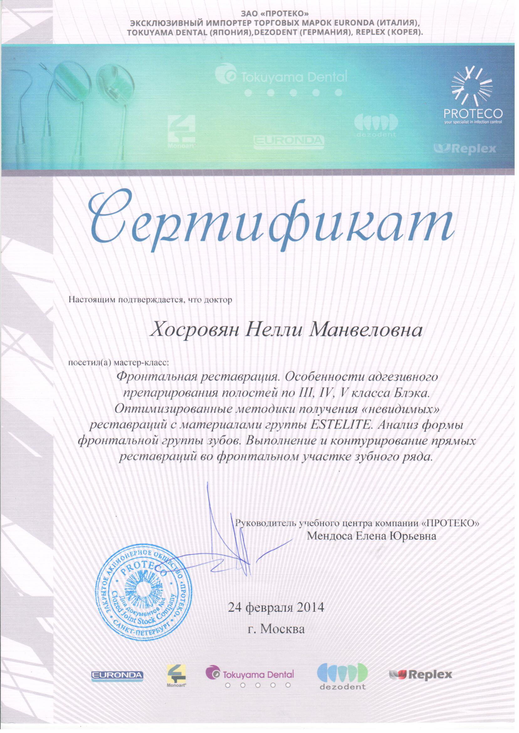 - 2014 г. – мастер-класс «Фронтальная реставрация, Особенности адгезивного препарирования полостей по III, IV, V класса Блэка. Оптимизированные методики получения «невидимых» реставраций с материалами группы ESTELITE. Анализ формы фронтальных группы зубов. Выполнение и контурирование прямых реставраций во фронтальном участке зубного ряда», Мендоса Е.Ю г.Москва.