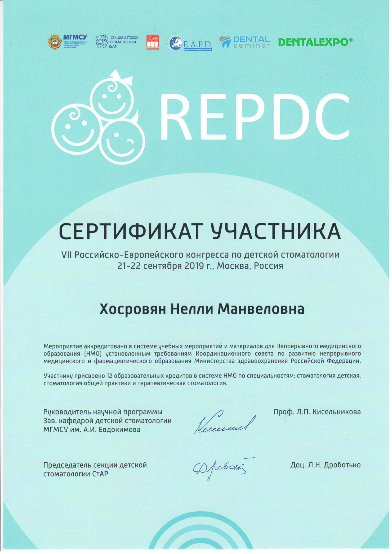 - 2019 г. - принимала участие в IV Российский региональный конгресс Международной ассоциации детской cтоматологии IAPD.