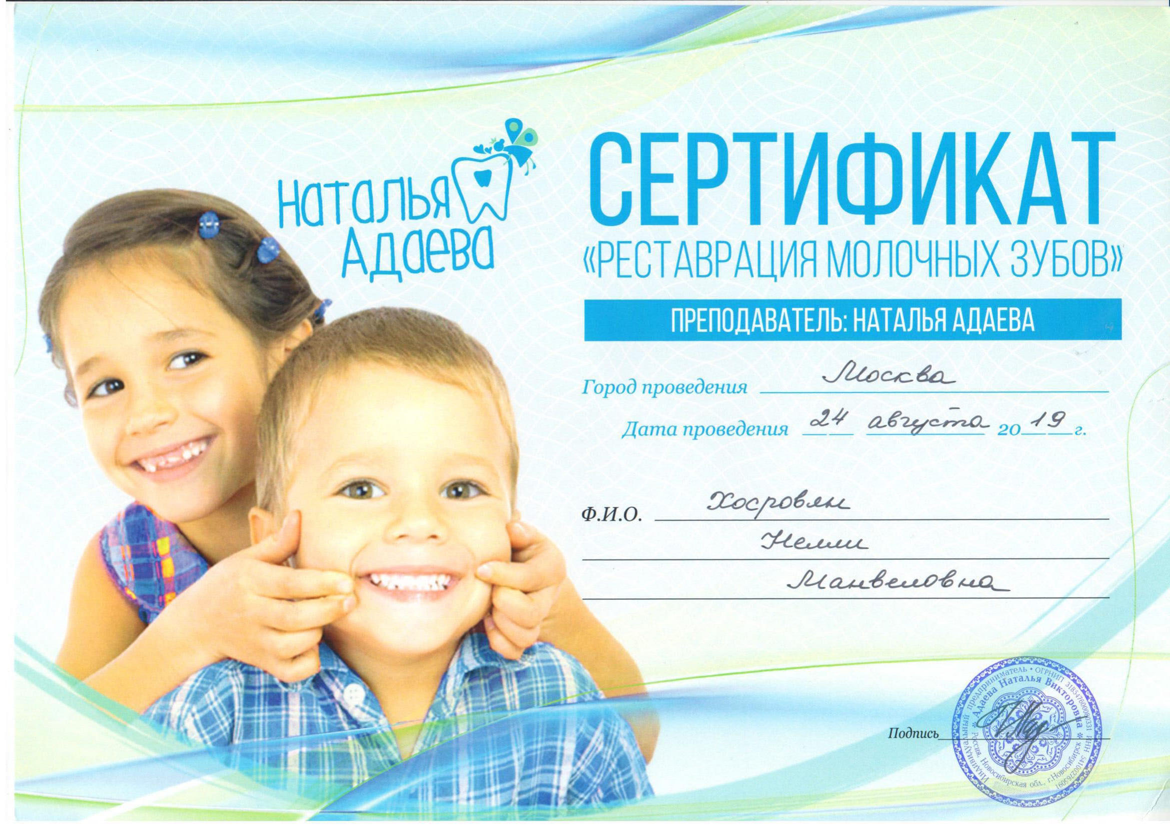 - 2019 г. – практический семинар «Реставрация молочных зубов», Адаева Н.В., г.Москва.