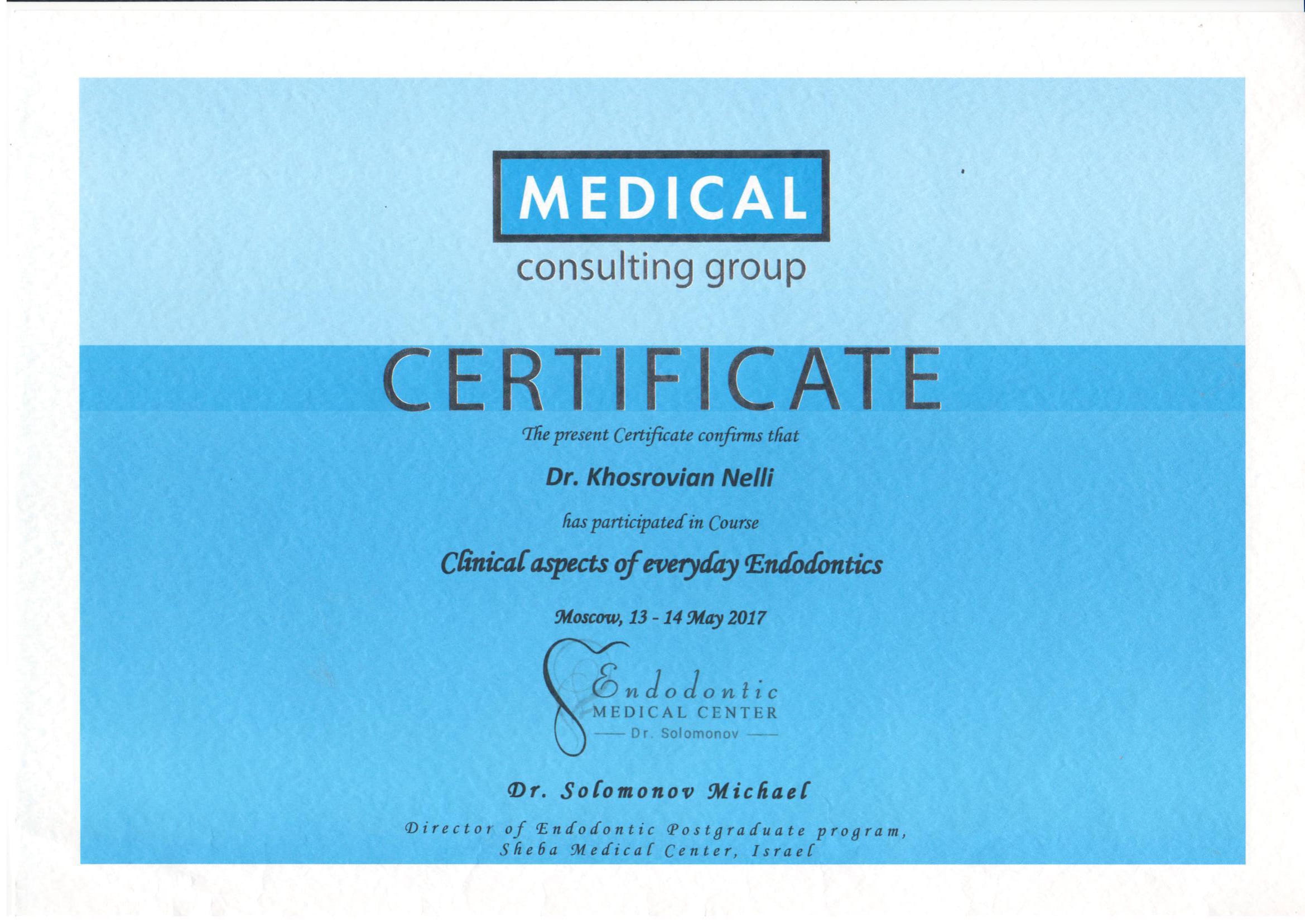 - 2017 г. – семинар Dr. Solomonov Michael на тему: «Clinical aspects of everyday Endodontics». Декабрь 2017 г. – практический семинар «Местная анестезия в терапевтической стоматологии. Индивидуальный подход», Васильев Ю.Л., г.Москва.