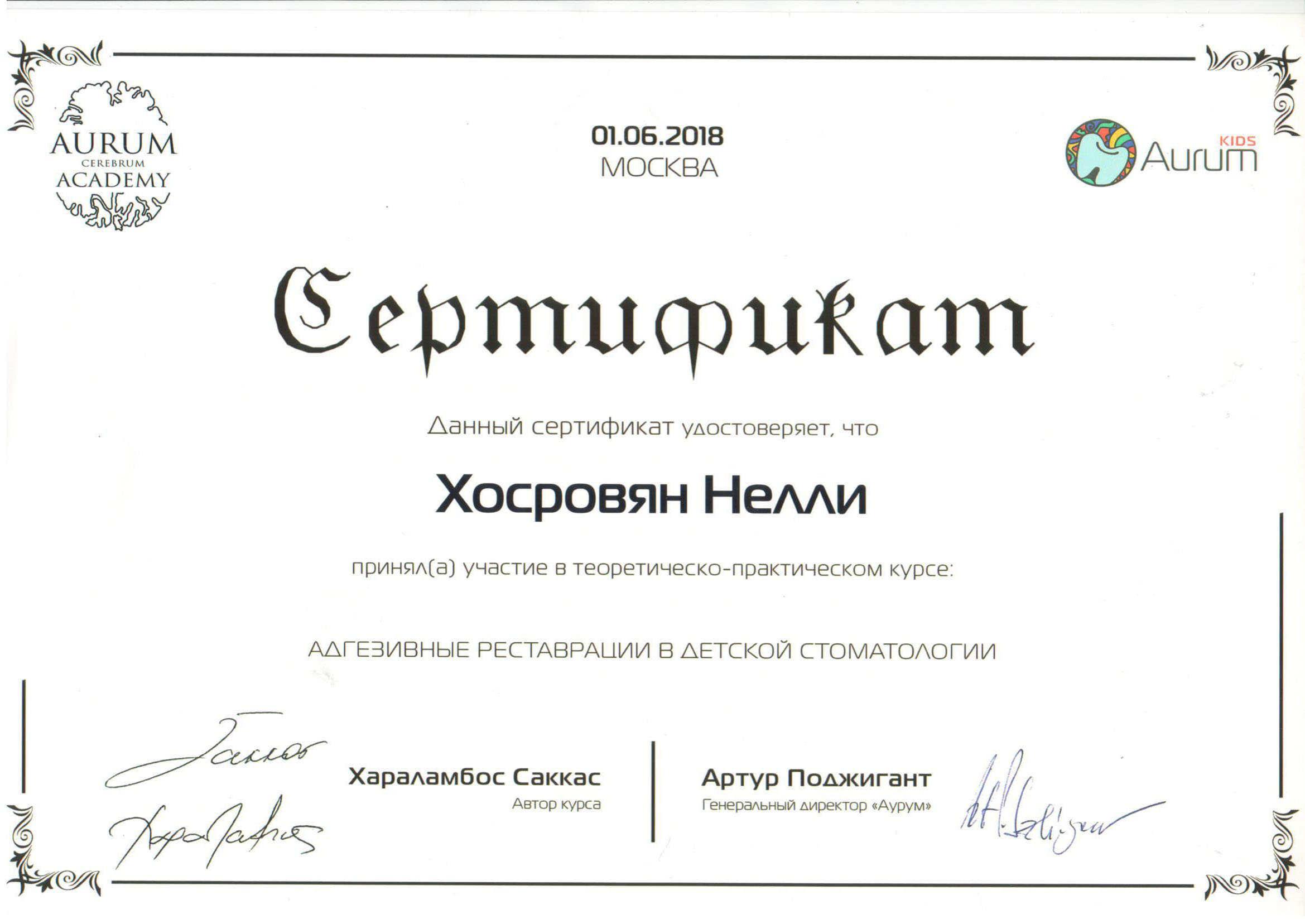 - 2018 г. – практический семинар «Адгезивная реставрация в детской стоматологии», Хараламбос Саккас г.Москва.