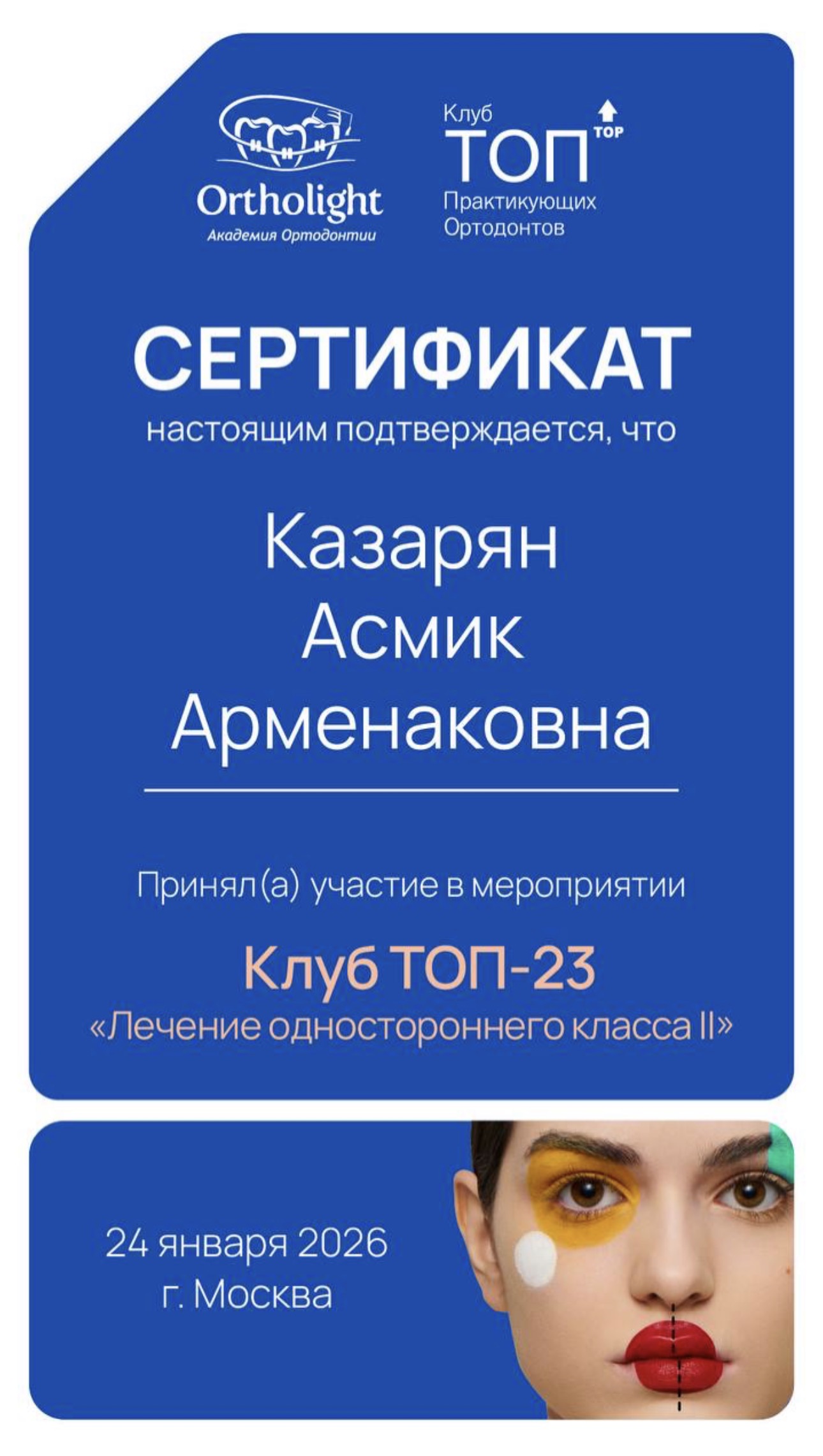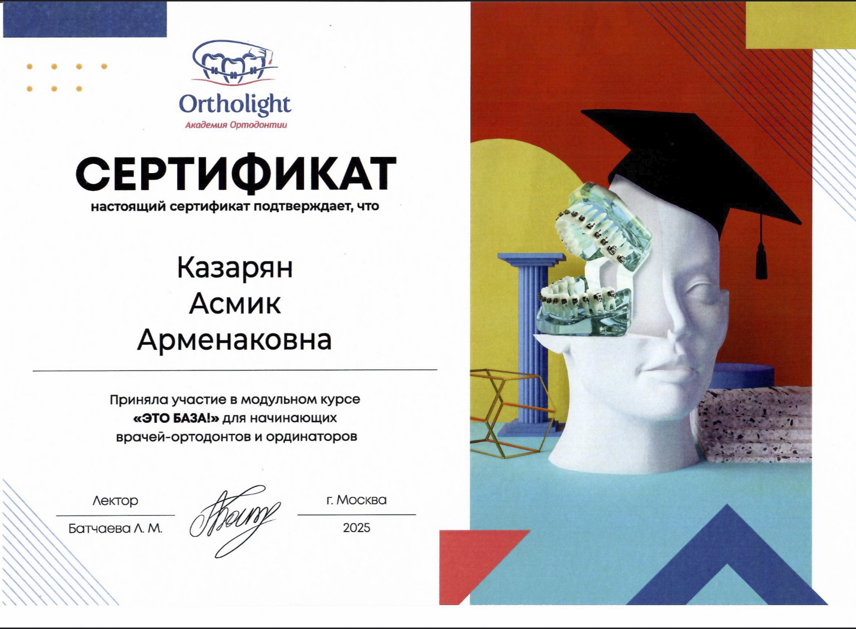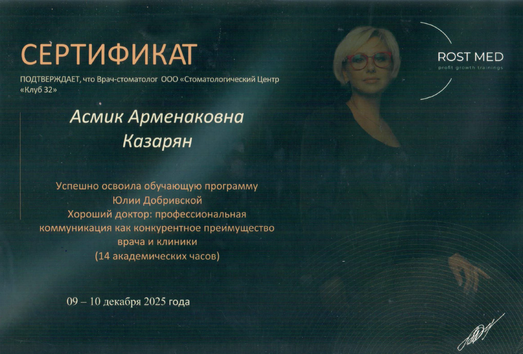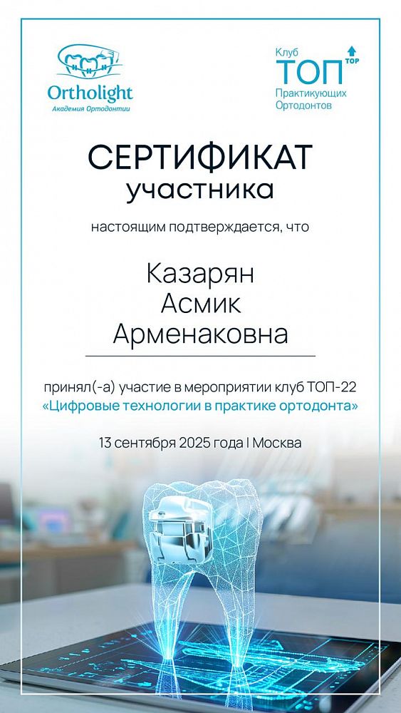 Постоянное развитие — ключевой принцип в работе доктора Казарян. Она регулярно повышает квалификацию, осваивает новые методики лечения и участвует в профессиональных семинарах и мастер-классах по ортодонтии и современной терапевтической стоматологии. Особое внимание уделяет совершенствованию знаний в области коррекции прикуса и эстетики улыбки.