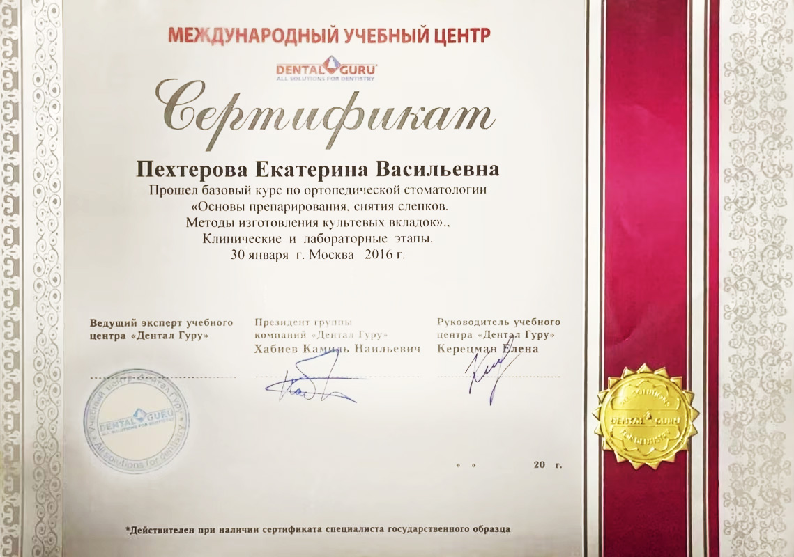 - 2016г.«Основы препарирования, снятия слепков. Методы изготовления культевых вкладок», Международный учебный центр «Dental Guru»