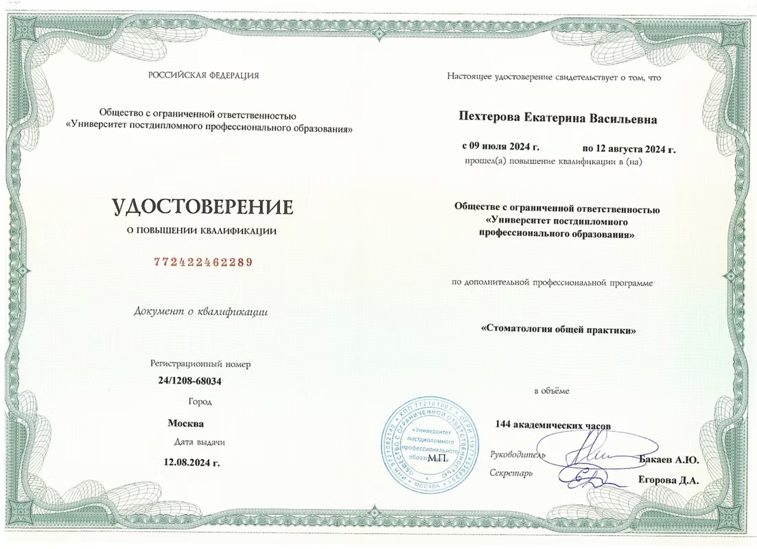 Был на приеме у Пехтеровой Екатерины Васильевны, очень чуткий врач. Очень порадовала анестезия - во первых не больно, во вторых очень быстро отходит(вроде какая то испанская, сильно не вникал). В целом приёмом очень доволен, цены тоже более чем приемлемые.