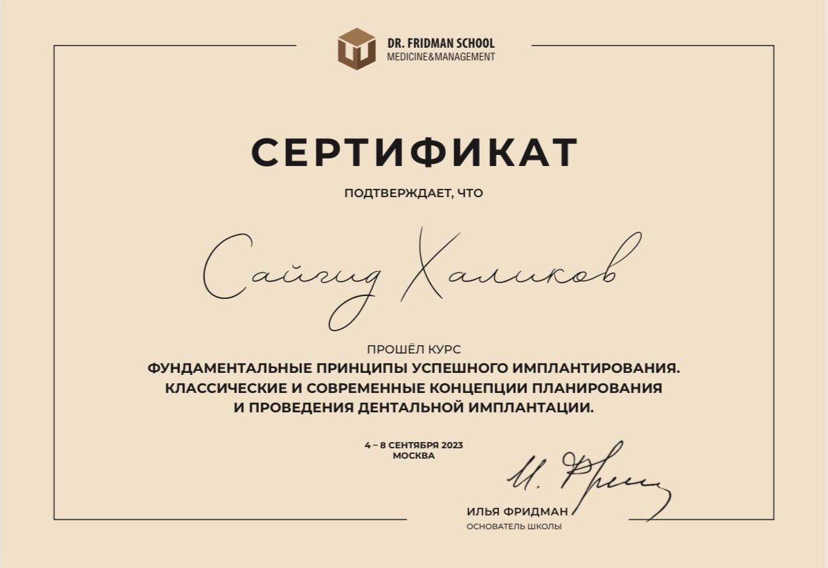 - 2023 г. Курс по имплантационной медицине полости рта для врачей-стоматологов Доктора Ильи Фридмана: «Фундаментальные принципы успешного имплантирования. Классические и современные концепции планирования и проведения дентальной имплантации.»